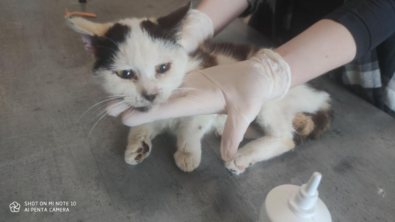 Pięć młodych kotów skrajnie wychudzonych, zaniedbanych i wyłysiałych z powodu pcheł i wszołów walczyło o życie.