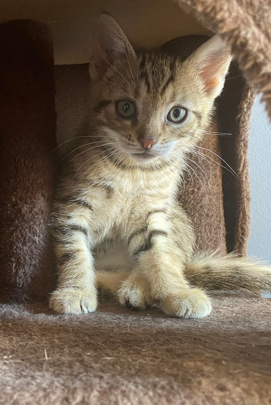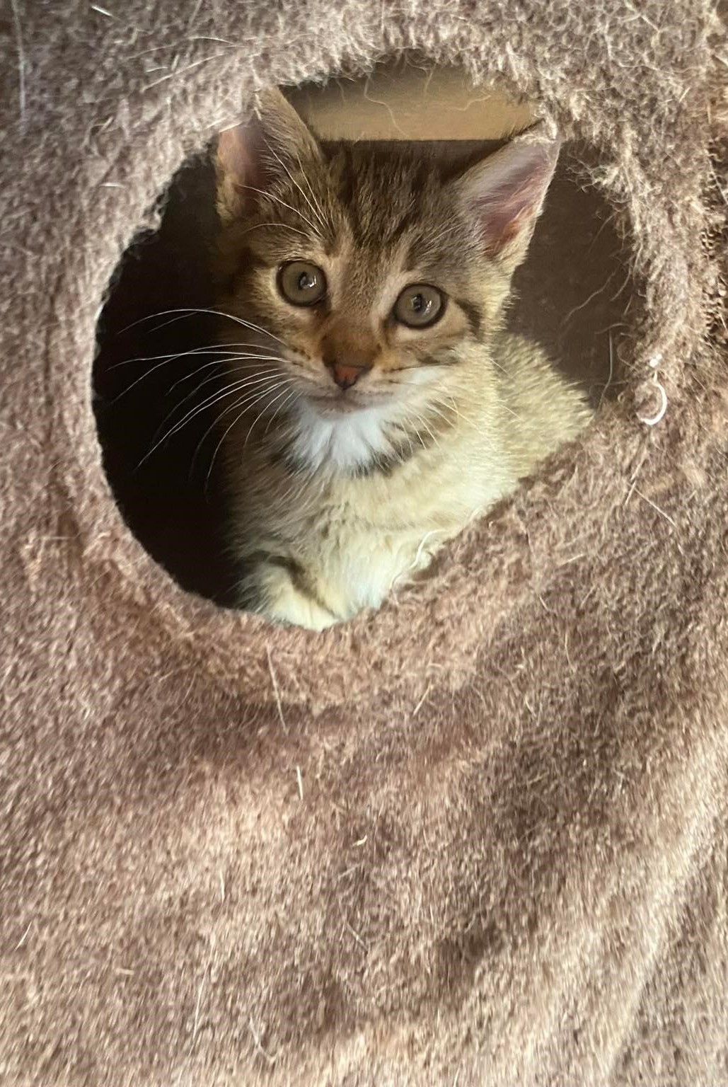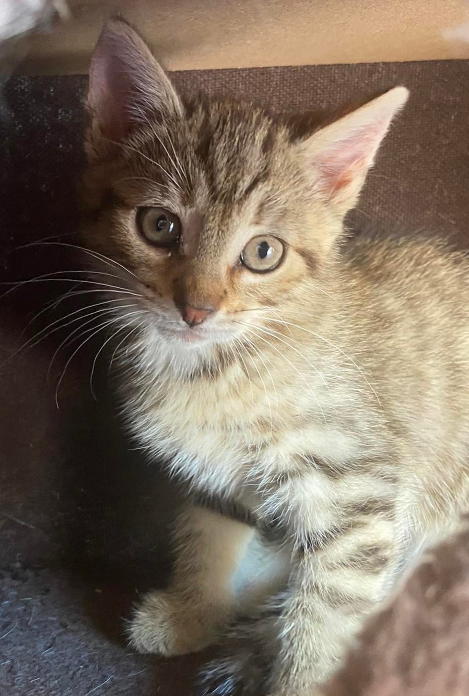 Mała jak przystało na kocie dziecko, bawi się radośnie wśród rodzeństwa i jeszcze nie zdaje sobie sprawy ze swojej bezdomności. Jej świat to niewielki pokoik i trochę fundacyjnych zabawek.